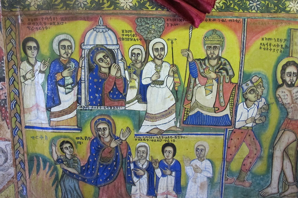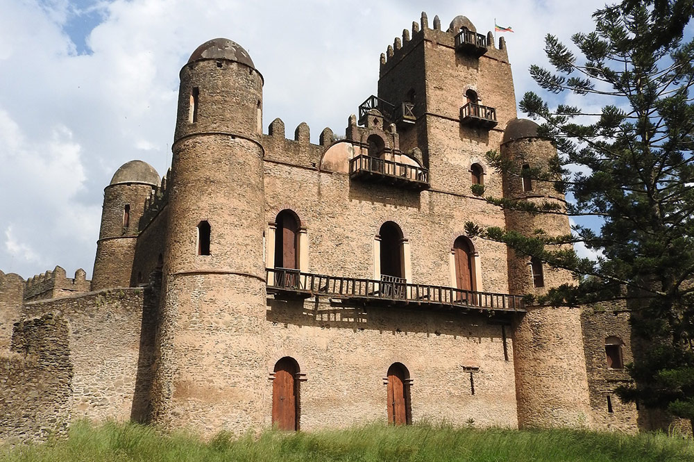 Chegada a Gondar. Após as invasões muçulmanas que devastaram o país no século XVI, o imperador Fasilidas estabeleceu a sua capital em Gondar. A cidade manteve este estatuto até meados do século XIX. Deste período glorioso da história da Etiópia, podemos admirar a cidade imperial, onde foram construídos numerosos monumentos entre os séculos XVII e XVIII, ainda hoje magnificamente conservados: o castelo de Fasilidas, o primeiro edifício maciço e poderoso; o castelo esguio de Yasou I; os castelos de Bakka e Mentouab; o Palácio da Música de David III; o castelo de Qusquam. É uma visão surrealista admirar estes edifícios de inspiração europeia no coração de África. É verdade que os jesuítas portugueses estiveram presentes na corte dos reis de Gondar durante o século XVII. Na altura, tinham sido incumbidos pelo Papa da missão de trazer o reino herético do padre João de volta ao seio de Roma. Pedro Paez, o mais ilustre dos jesuítas, falhou por pouco, e os etíopes permaneceram ortodoxos, ligados à Igreja de Alexandria. Continuamos a nossa visita à igreja de Debre Berhan Selassie (Luz da Trindade), cujo interior está decorado com belos frescos, querubins e pinturas.